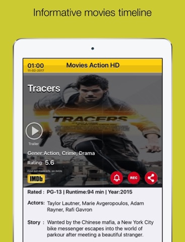 -movie name, TV channel name, rating, genre, year of production, runtime. actors and story.