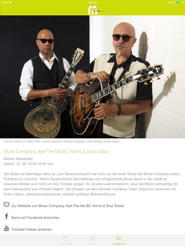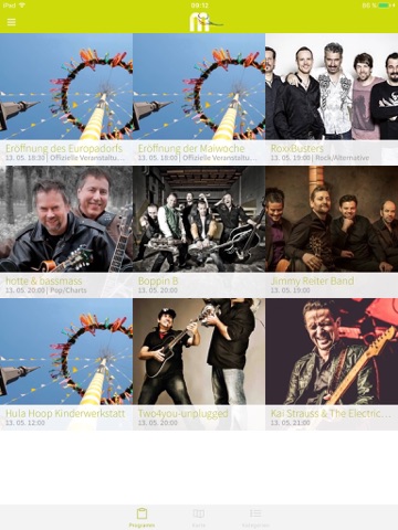 Die App zeigt direkt bei Aufruf sämtliche Veranstaltungen des jeweils aktuellen Tages. Über einen Slider kann bequem zwischen den einzelnen Veranstaltungstagen (inkl. Wettervorhersage) gewechselt werden.