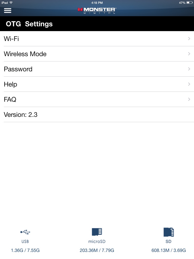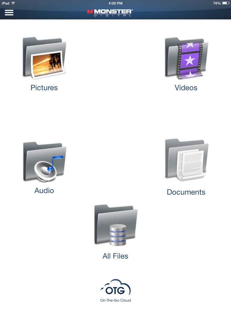 Use the Monster Digital OTG Cloud app with the OTG Cloud device (sold separately) to wirelessly access and share videos, photos and music on SD cards, microSD cards, USB flash drives and hard drives through your iPhone, iPad, iPod touch and Mac. Any device with Wi-Fi and our App or a browser to can access memory connected to OTG Cloud to upload, download and stream.