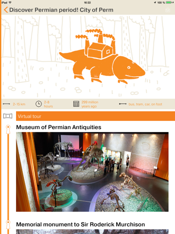 "Discover Permian " - multimedia guide includes objects of geology, culture and history of the Permian geological period (299 - 251 million years ago) - the only "chapter" in the Earths past opened on the territory of Russia and having a Russian name. Tourist routes includes trips around the city of Perm available just now and Perm region. According to the results of "national testing" will be released the final version of the media guide in September 2014.