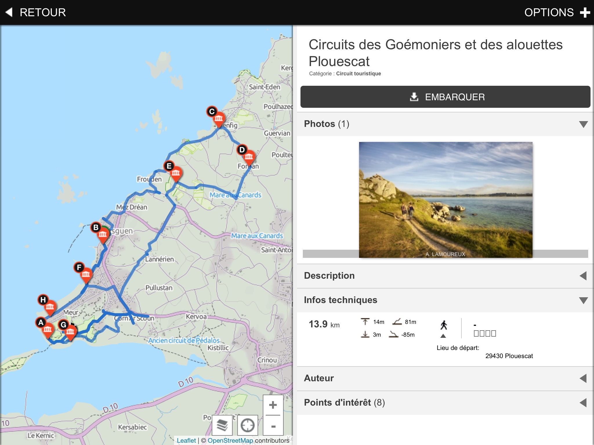 Vous êtes guidés tout au long du parcours. Embarquez la balade sur votre smart phone. Même en mode déconnecté, les informations parcours vous précisent les différentes étapes et votre position s’affiche en temps réel sur la carte grâce au GPS.