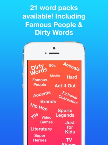Split up into 2 even teams. Gather in a circle so that no player is sitting next to their teammate (alternate). Choose a player to start the game. The player then has to give clues about the word so that someone on their team shouts it. You cannot say the word or give clues that rhyme with your phrase. When your team guesses the word/phrase, pass the device to the next player (of the opposing team). Swipe left to generate the next word. Keep playing until the time runs out. The team holding the device when the buzzer sounds loses (opposing team gets a point). Repeat until a team has the necessary points to win.