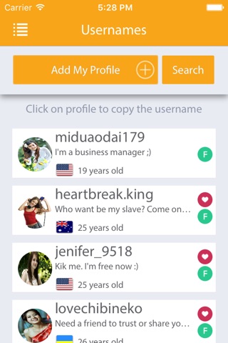 Simply tap on a users profile and their username will be conveniently added to your clipboard to paste straight into application