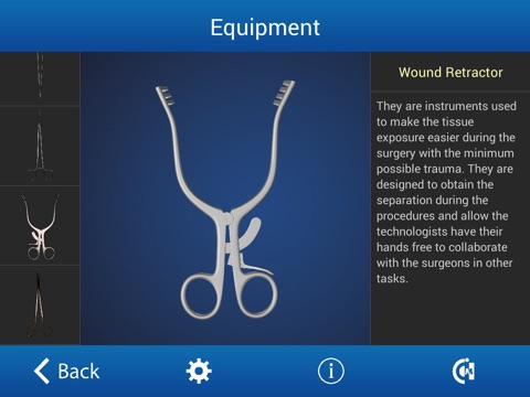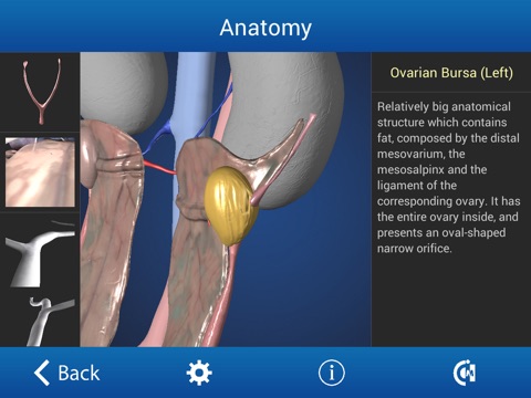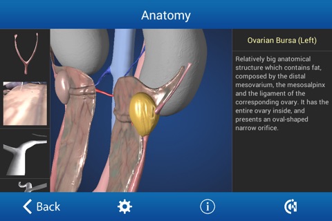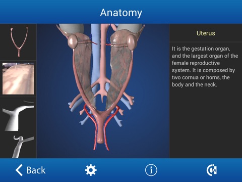 App for Tablet / mobile devices focused on the canine ovariectomy surgery procedure. Using realistic 3D models, it is possible the interactive visualization of every anatomical component of the female reproductive system in this animal species, including descriptions of position and functions. It also offers both a 3D visualization of the involved surgical equipment, and a graphical diagram of the preparation for the preoperative phase.