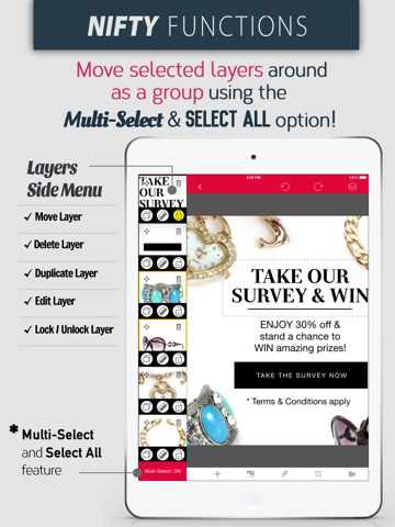 View all the elements you have added using LAYERS SIDE MENU. You can directly access a particular element here too. Theres also quick access to functions like "Delete", "Move", "Duplicate","Edit", "Lock/Unlock","Multi-Select" & "Select All", ideal for layouts with complicated design.