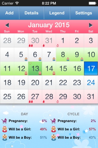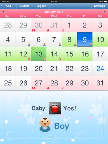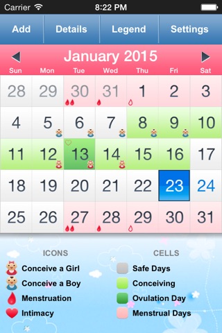 Menstrual Calendar for Men can not guarantee accurate prediction of gender of a baby, but its based on real scientific researches. It is a special edition of ovulation calendar for men. It helps you determine fertile days of one or more girls, so you can either achieve or avoid pregnancy. The calendar uses the date of the last period and shows the next period date, the best days to conceive a girl or a boy, the ovulation day and when you should avoid pregnancy. The application every man must have!