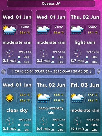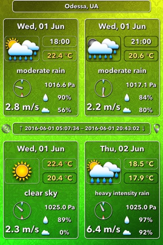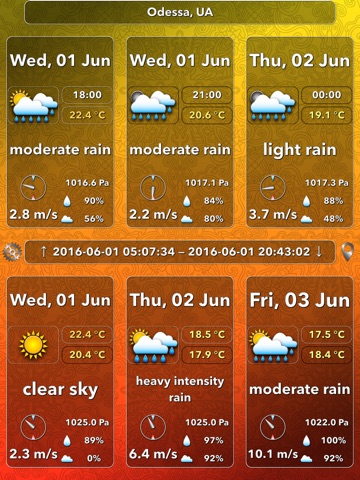 ● The most informative weather information (date, time, weather image that refines the description of weather, temperature, barometric pressure, relative air humidity, cloudiness, wind speed, wind direction, sunrise, sunset);