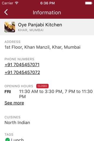 * View menus, pictures, phone numbers, directions, user testimonials, and all the other information about the restaurant.