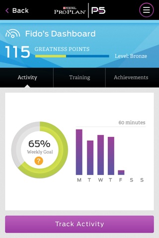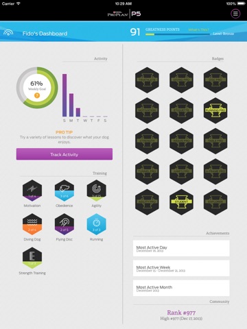 P5 dog training app from Purina Pro Plan is the perfect tool to help you train your puppy or dog. We’ve loaded the P5 app with video training tutorials and our patented dog activity tracking software to help you set goals, learn training skills and track your dogs activity and progress anywhere you have your iPhone or iPad mobile devices. Download the P5 dog training app now and get your dog started on their path to greatness.