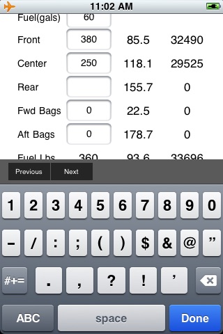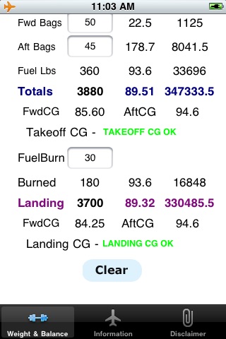 If proposed fuel burn is entered (in gallons), a landing CG check is performed. Proper cargo loading positions are also checked- overloads give alert messages and are flagged.