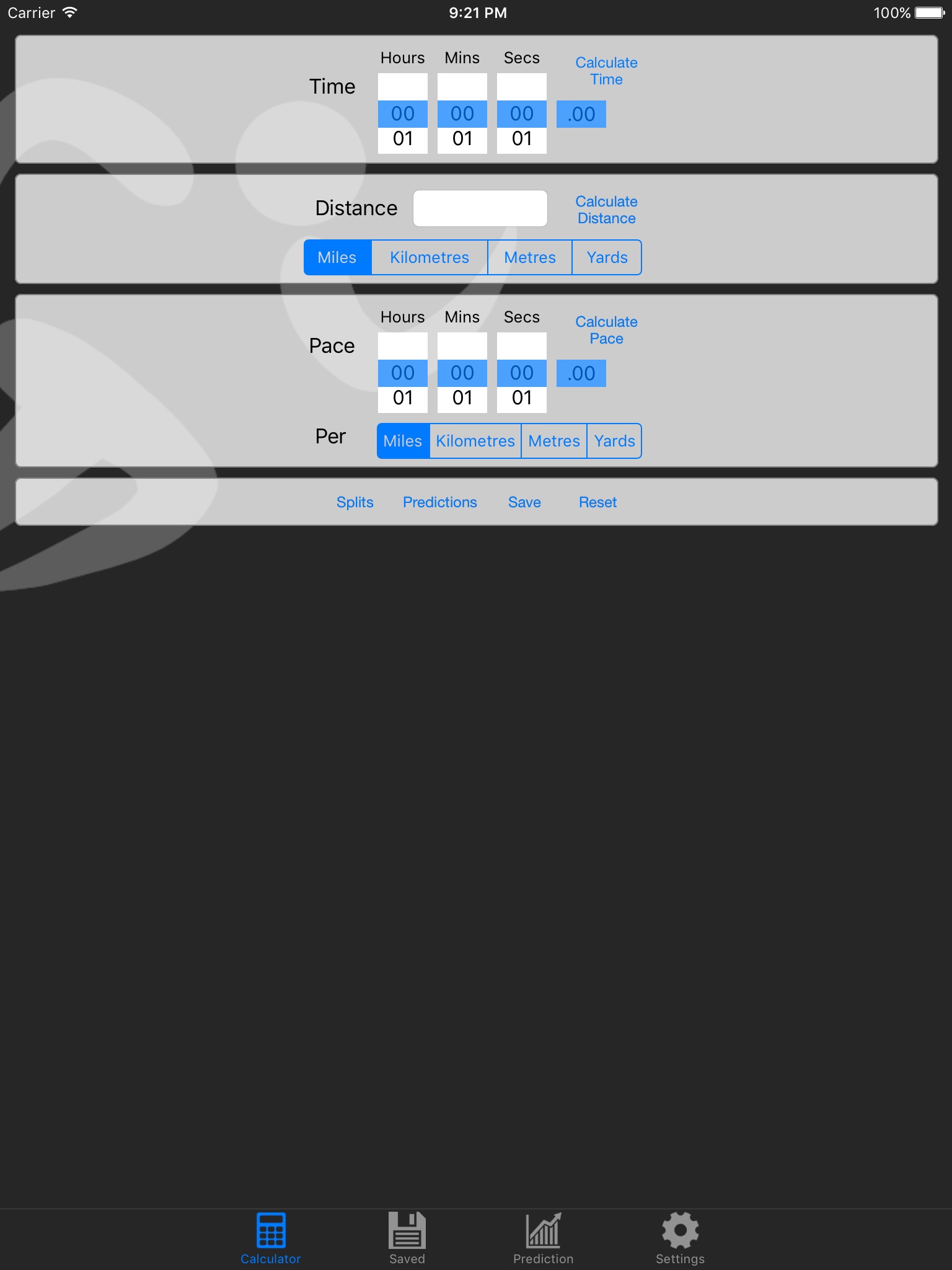 Great app design. One of the best for a pace calculator. The saving feature is also a great idea. It would be nice to select a different amount of meters when calculating the pace such as 400m.