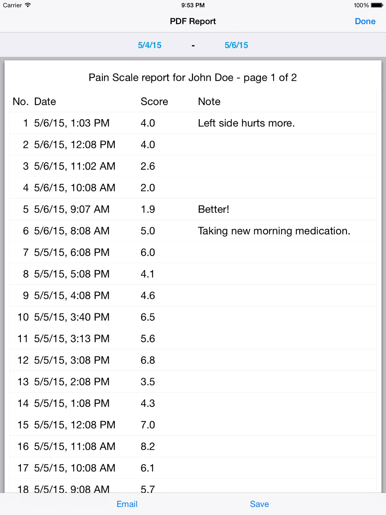 Individual pain estimations will be saved automatically along with date, time and an optional note.