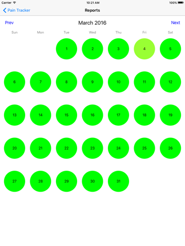 The calendar view lets you easily see what days you had pain, and with the color changing dates you can see how severe it was. You can also click individual dates to see what time you logged a pain.