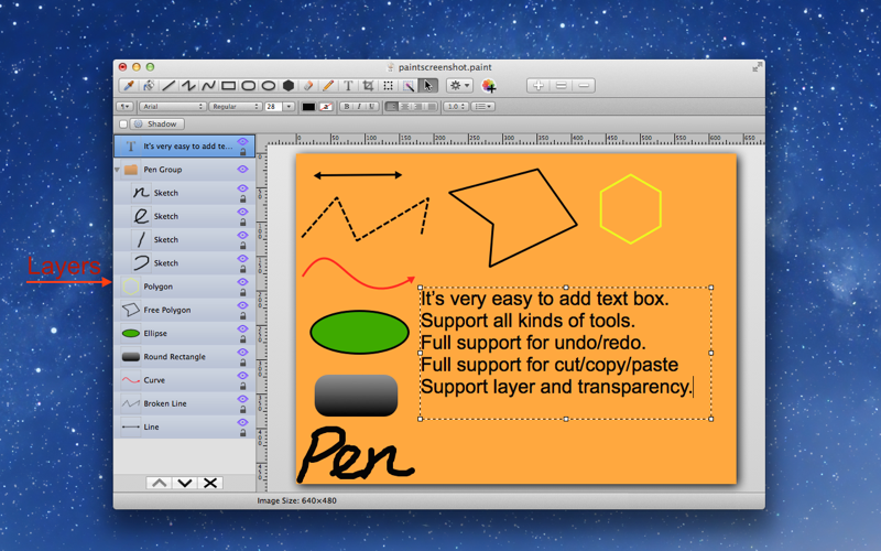 - Support all kinds of tools, including fill, eyedropper, line, curve, rectangle, ellipse, text and so on.