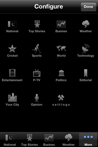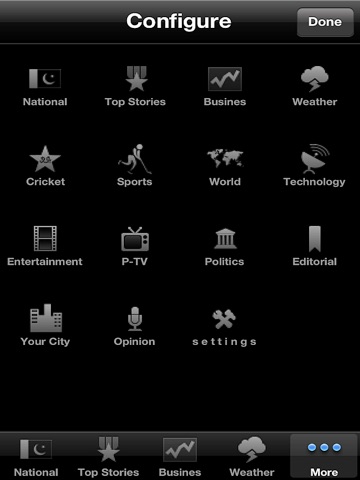 News is fetched from 84 different Pakistan news sources and are categorized into different sections as,