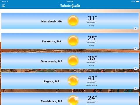 The Palacio Gueliz App comprehends several trips and apartment rentals in the city Marrakech, Morocco. You will find several different types of one-day trips as well as different types of apartments. Palacio Gueliz offers you the possibility to pay upon arrival or using PayPal.