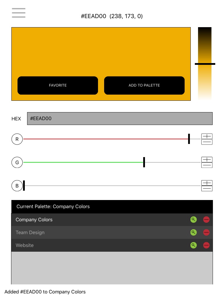 Intuitively customize your own palettes using standard rgb sliders. The palette editor supports the addition and removal of individual colors, and the display of rgb and hexadecimal color information in a streamlined fashion. In addition you can save your favorite colors in a queue, and quickly retrieve and load them by simply tapping them.
