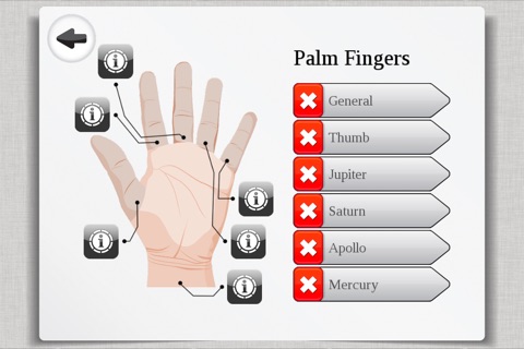 PALM FINGERS: General Finger, Thumb Finger (fingernail), Jupiter Finger, Saturn Finger, Apollo Finger and Mercury Finger.