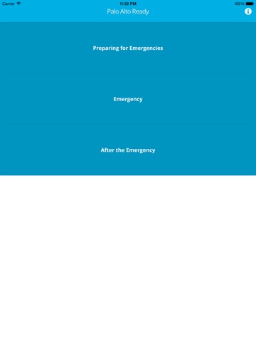 Palo Alto Ready provides information for iOS users to use to learn about emergency options before, during, and after a City of Palo Alto community emergency. Content is installed on the device so that connectivity is not required. This is helpful in the event of a significant emergency where telecommunications are not available and access to content in the app is desired. As necessary, new content will be made available to the app. The app should be considered supplemental to all other priority services such as 911, Fire Service, Federal Emergency Response, and others. The app serves mainly as an educational utility.