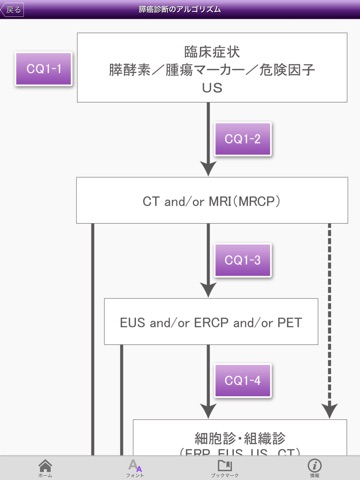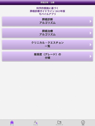 This app uses content taken from the Pancreatic Cancer Medical Guidelines 2013 Edition issued by the Japan Pancreas Society (publisher, Kanehara & Co., Ltd.) for use on smartphones and tablets. There are links from the diagnostic and treatment algorithms (flowcharts) to the related Clinical Question (CQ), and you can browse recommendation, grading of recommendation, and “Proposal for the future”.
