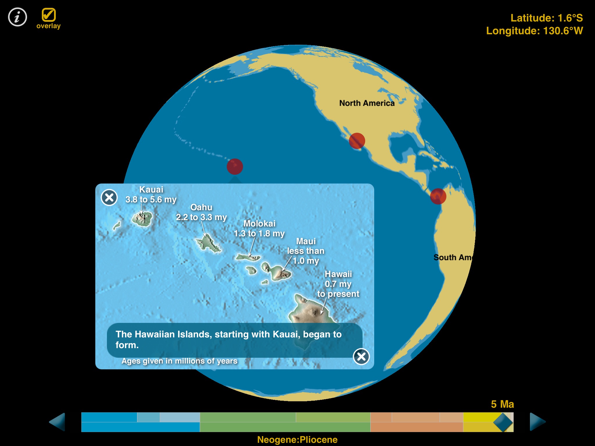 The pangaea app dynamically shows the breakup of the supercontinent Pangaea and the positions of the continents over the last 200 million years on a 3D globe. Significant events are indicated on the globe at the time of the event (millions of years ago). Tapping an event provides information about that event, certain events have an illustration with additional information.