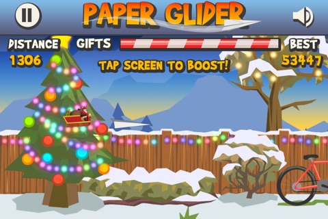 Swipe to launch your Paper Glider past the Christmas tree and out over the sleeping city! You can boost by dropping presents, but don’t use them all too fast!