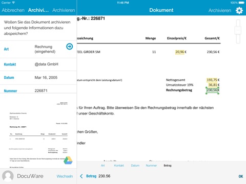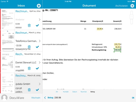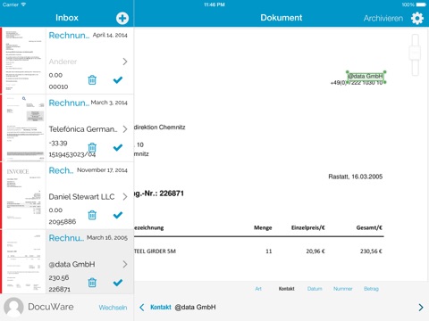 With PaperOrganizer by DocuWare you can scan all your documents easily and store them on a cloud drive. Bills, letters, convenants, orders, bills of delivery or statements of account - everything is immediately recognised, analyzed and intelligently stored. Take advantage of all the possibilites your cloud drive brings along: Security and access from everywhere - completely free.