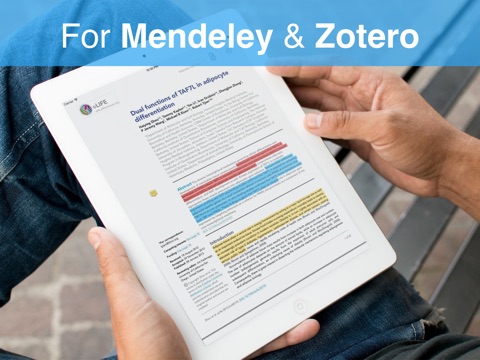 SYNC | Always stay up to date between your mobile library and your desktop application. Once you add or annotate a PDF, it will wirelessly be saved on the Mendeley/Zotero platform to be available on all of your devices.