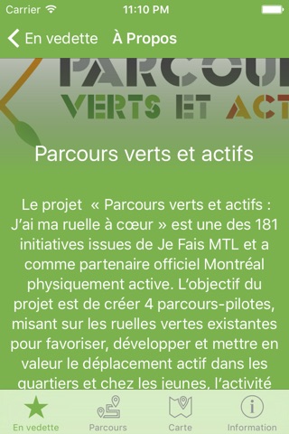 Le projet « Parcours verts et actifs : J’ai ma ruelle à cœur » est une des 181 initiatives issues de Je Fais MTL et a comme partenaire officiel Montréal physiquement active. Par la création de 4 parcours-pilotes, l’objectif du projet est de miser sur les ruelles vertes existantes pour favoriser, développer et mettre en valeur le déplacement actif dans les quartiers et chez les jeunes, l’activité physique, la socialisation et les connaissances culturelles, artistiques et historiques.