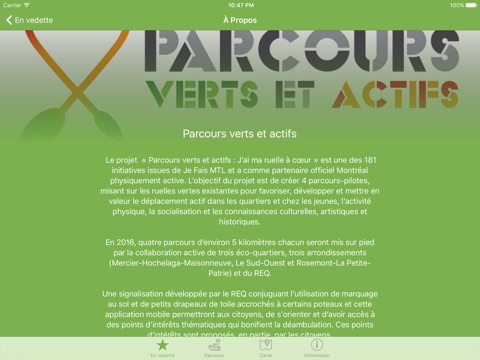 La présente application mobile vous permet de mieux vous orienter sur les quatre parcours d’environ 5 kilomètres, grâce à une carte géolocalisée de vos déplacements.