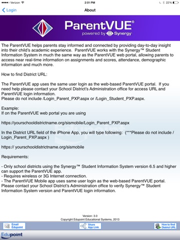 • Only school districts using the Synergy™ student information system version 6.5 and higher can support the ParentVUE for the iPhone application.