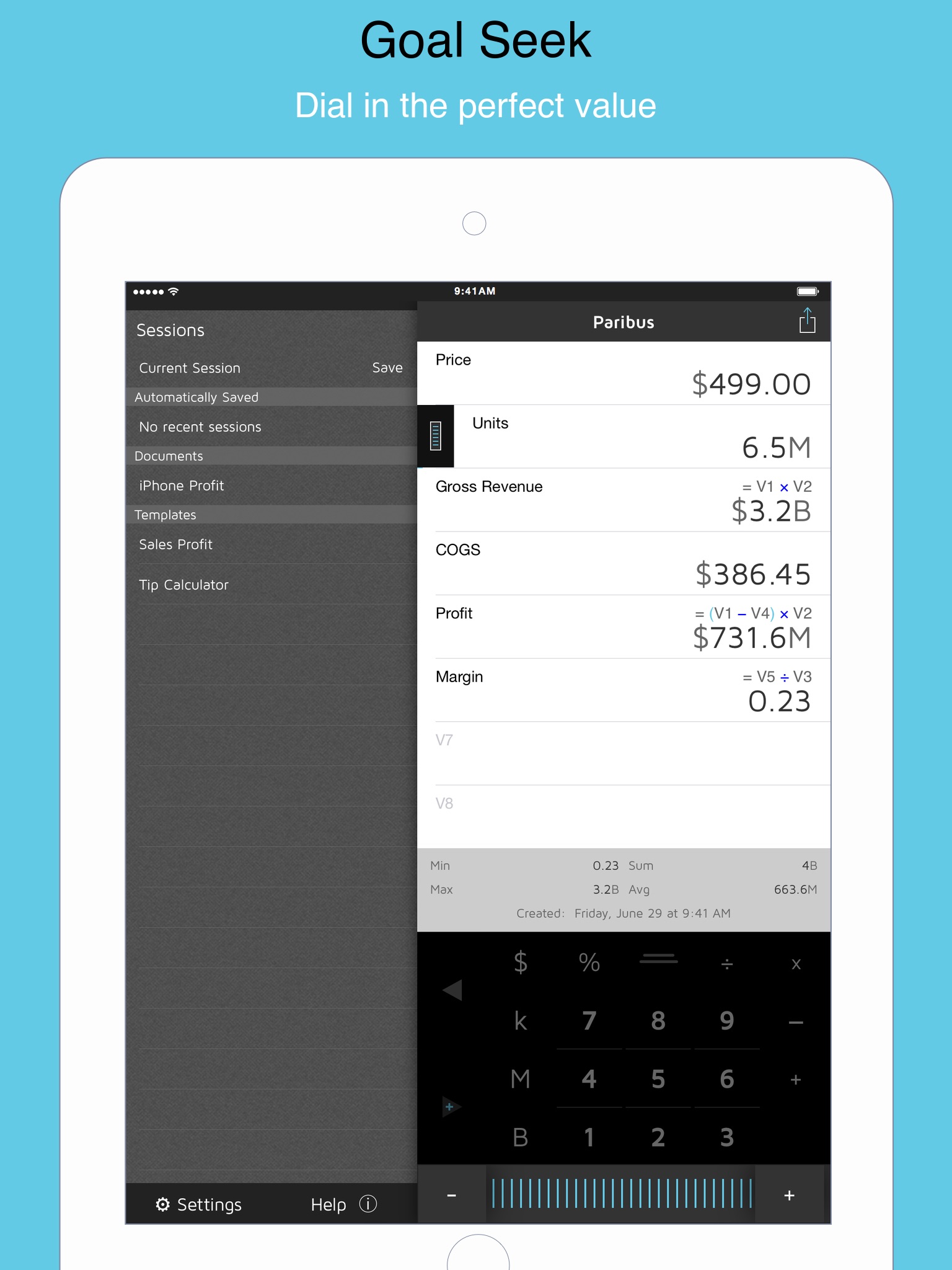 Goal Seek: Paribus has an innovative value dial that lets you spin up/down the values so you can see the effect on your results.