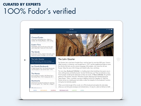 The Fodors travel app is beautifully designed. The information is extraordinarily clearly presented, making excellent use of the iPads technological advances. The graphics are stunning, the maps clearly laid out, and the interactive aspects are very smartly incorporated. The descriptions of points of interest are also very well written. Undoubtably much thought and effort went into developing this first class travel tool. With or without a WiFi connection, it is a pleasure to have this comprehensive, easily navigable reference available. It has eclipsed LP for me. Bring this app along and you will sail through your itinerary! (I found the off-line maps, incidentally- seamlessly woven into the app itself. Not sure why this review is appearing twice, however.)