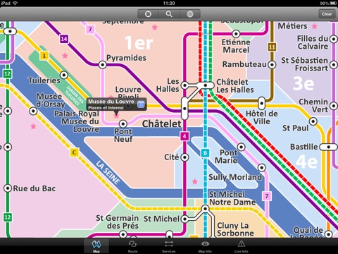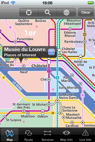 The Paris Metro application is a superb professionally drawn map and route planner for the Paris Metro, RER and Tram systems with many unique features. The inbuilt map provides a simple and colourful view of the city metro services with the ability to flip to the online map view when an internet connection is available. This way the user can view the online map feature when above ground and the transport map and route planning is still fully functional underground. This provides the best of both worlds, the transport map and route planning anytime, anywhere and online maps and search when a connection is available. You can also use your inbuilt GPS to see the nearest transportation stop and distance to it.