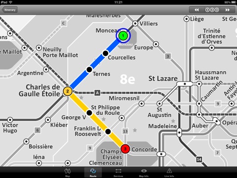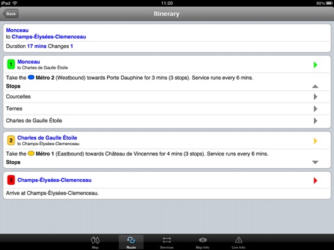 Comprehensive details of your planned route are provided, including changes, directions of travel, number of stops, predicted journey times, etc. Uniquely this application gives you “direction”, “towards” and “service frequency” information (not available on any other offline journey planner) for example “Take the Métro (Southbound) towards Châtelet for 10 mins (6 stops). Service runs every 7 minutes” which is essential when trying to find the correct platform and connection. Also given are alternatives for each leg of the journey.