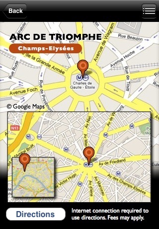 Perfect for tourists: the app takes advantage of the new StreetView feature of Google Maps. It is available with a tap from our map screen, giving you a full panoramic view of each sight and its surroundings. You will surely enjoy this even if you are not in Paris.