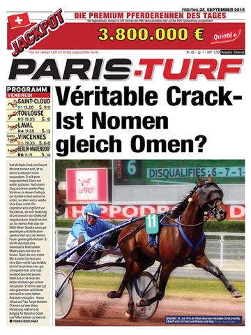 Sie bekommen den vollständigen Inhalt unserer Zeitung PARIS-TURF DEUTSCH mit ausführlichen Informationen zum täglichen Hauptrennen Quinté+, wo es mindestens 2 Mio. € zu gewinnen gibt. Zusätzlich: Die französische Ausgabe PARIS-TURF in der ePaper-Version. Profitieren Sie so von den besten verfügbaren Informationen über PMU-Pferderennen und -Wetten. Renommierte Journalisten und Experten besprechen die aktuellen Rennen und liefern Wett-Tipps für sämtliche PMU-Prüfungen.
