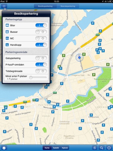 För dig med boendekort finns en kartvy som endast visar de p-platser där ditt boendekort gäller. Du som är ute efter en besöksparkering har möjlighet till att filtrera p-platser baserat på Bilar, Bussar, MC, Handkapp-platser och antalet p-platser.