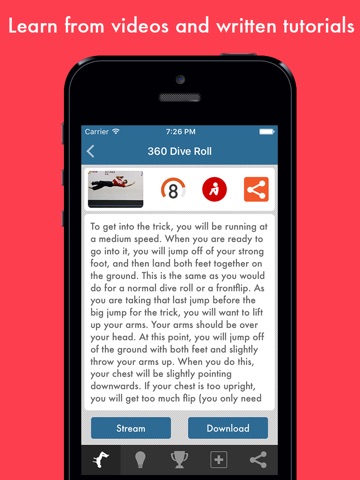 This parkour tutorial app really helps you to learn tricks and progress in them. Also, you dont just look up whatever video you want. You have to land the tricks they have first and then you buy new ones with coins. Its a really cool strategy. But the only thing is its hard to get coins, but other than that its a crazy awesome app.
