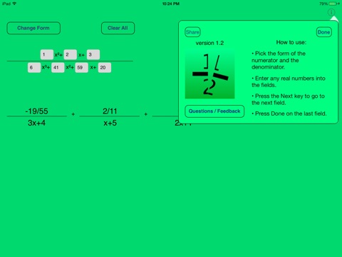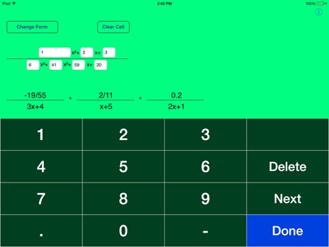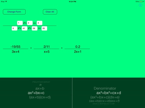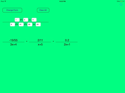 Partial Fractions is a handy way to compute partial fraction expansions. It works for 2nd and 3rd order denominators and supports many different input forms (listed below). Supports real and complex answers. It is very useful when trying to integrate fractions.