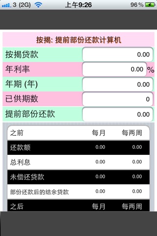 “部份还款计算机”呈现2种情况:还款年期不变、还款银码不变,及2种还款方式:“每月”及“每2星期”
