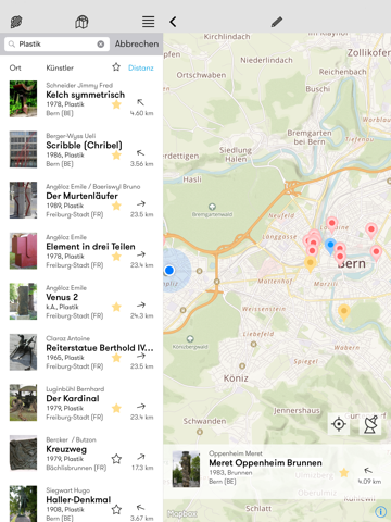 Orientieren: GPS Ortungsfunktion/ Kartenansichten/ Schnellzugriff auf Kunstwerke in ihrer Nähe