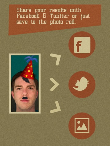 Load photos from the devices camera or photo library; once youve created your masterpiece, share directly to Facebook & Twitter. You can also save the photo to your library and share anywhere else from there.