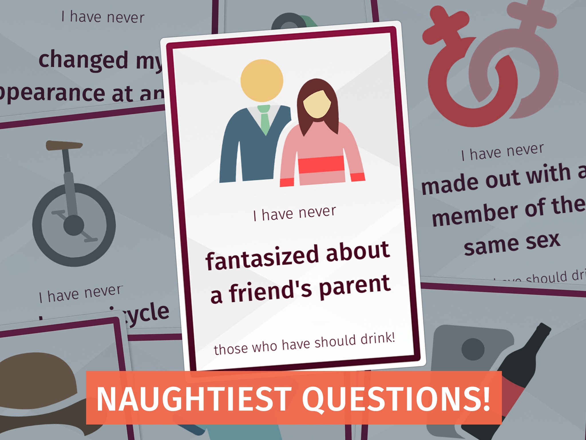I have never is our take on the classic drinking and party game by the same name. Find out your friends deepest, darkest confessions and reveal yours in the process with hundreds of unique tasks!