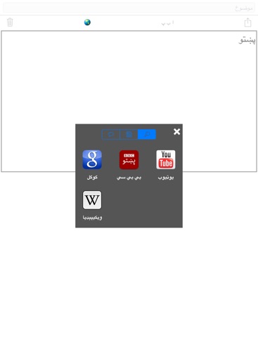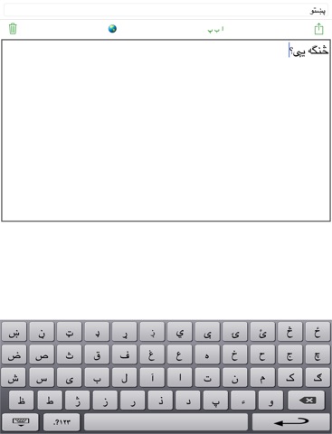 - switch between the custom Pashto keyboard and any iPhone keyboard (for example, if you want to type an email address in the middle of a Pashto message)