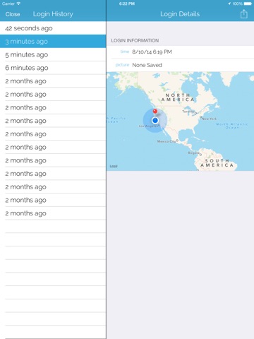 • Login History: PassProtect records the timestamps of recent logins, snaps pictures using the front-camera, and saves locations where the app is being used so you can be sure only you are using the app.