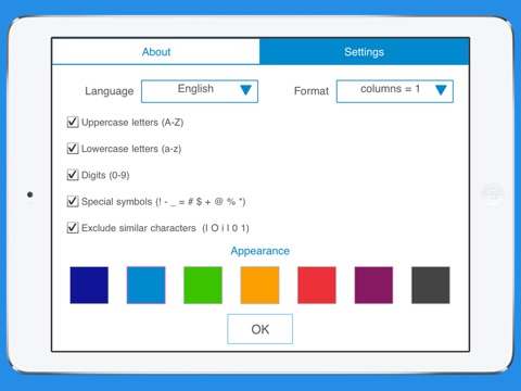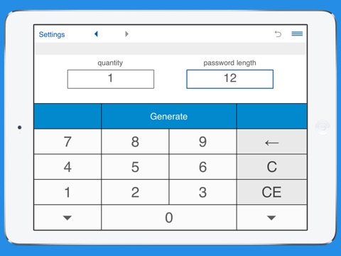 To generate passwords set the password length (up to 100 characters), number of passwords, configure options for the types of characters you want to include and tap Generate.