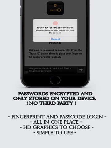 Well You dont have to worry no more, Password Reminder takes your User and Password Logins specific to every login there is and manages it securely with passcode and new and improved FINGERPRINT technology.