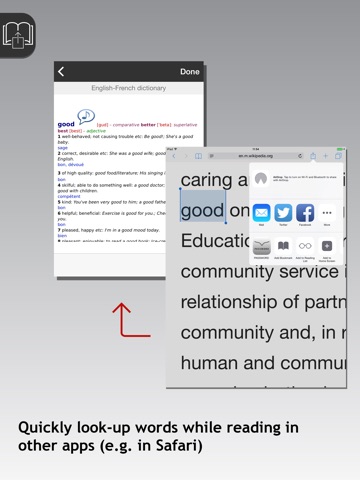 • New for iOS 8: You can now look up words while reading in Safari. Highlight any text and send it to the dictionary via the “Share” button. Please first enable the dictionary as a Safari extension.