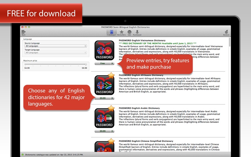 The PASSWORD Semi-Bilingual English Dictionary Apps offer the catalog of English dictionaries for 42 major languages: